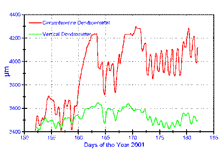 下图是慕尼黑科技大学在一棵欧洲云杉上实测的结果。红线为用DC型测的周长变化。绿线为用DV型测的纵向变化。在观测期间(五月初到六月中)云杉周长约增600μm。一般白天减少,晚上增加,昼夜相差达250μm。纵向变化没有增加的趋势,但明显反应昼夜和短期天气变化。干旱时树干短,湿润时树干长。纵向变化直接和Xylem water potential 相关(见CAF-Sensor)