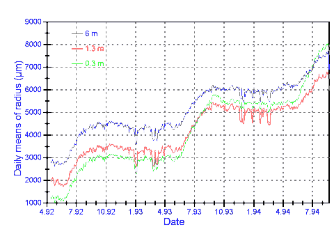 下图是用DR型Dendrometer在一株40年生欧洲云杉上连续三年测量的结果(日平均值)。测量部位的高度分别为0.3 m,1.3 m和6 m。