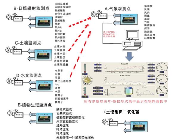 空气温湿度、气压、风速风向、雨量、光合有效辐射、紫外辐射、净辐射、近红外辐射、日照时数、蒸发、蒸散、CO2、NH4等