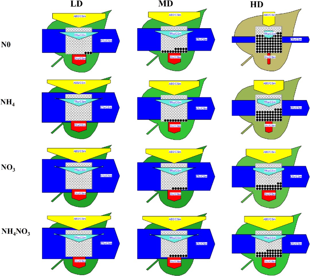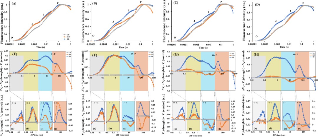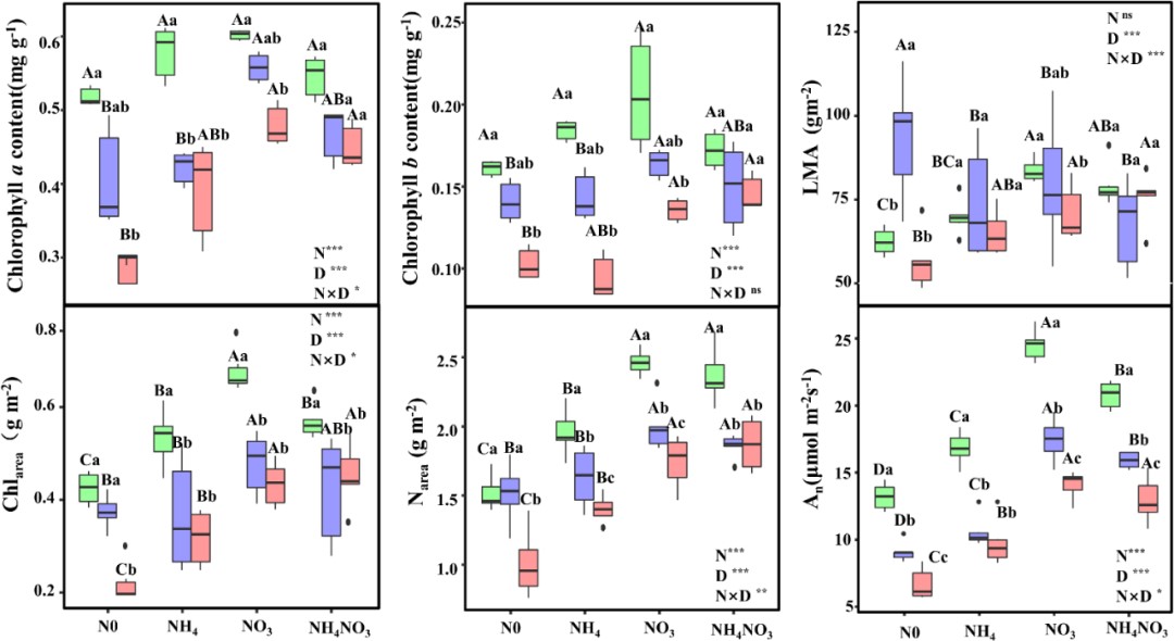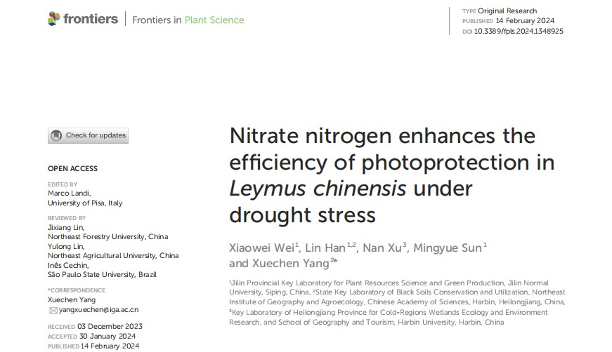 大气氮沉降主要有两种形式:铵态氮(NH4+-N)和硝态氮(NO3--N)。不同形态氮对植物光保护能力的调节,以适应干旱胁迫的研究很少。近期,吉林师范大学生科院未晓巍老师以松嫩草原优势种羊草为研究对象,设置了正常浇水(LD)、中度干旱(MD)和重度干旱(HD)3个干旱胁迫水平以及无氮(N0)、铵(NH4)、硝(NO3)和混合氮(NH4NO3)4个施氮方案的处理实验,分析了不同处理对羊草叶片中色素含量、活性氧(ROS)、光合酶活性、光系统活性、电子传递和OJIP曲线的变化,结果表明硝态氮提高了干旱胁迫下羊草的光保护效率。该研究中使用美国PP Systems公司生产的CIRAS-3便携式光合作用测定系统英国Hansatech公司生产的Handy PEA+植物效率分析仪分别测定了羊草的光合数据和OJIP曲线及JIP-test参数。研究结果“Nitrate nitrogen enhances the efficiency of photoprotection in Leymus chinensis under drought stress”发表在Frontiers in Plant Science(IF=5.6)杂志上。干旱胁迫下,硝态氮通过维持羊草叶片较高的叶绿素含量来保证其高光合性能。分析表明,增加硝酸盐施用量显著提高了干旱胁迫下羊草叶片单位面积叶绿素含量(Chlarea)和单位面积氮含量(Narea) 。在所有干旱处理(LD、MD、HD)中,与N0、NH4和NH4NO3相比,NO3处理的叶片光合速率显著提高。