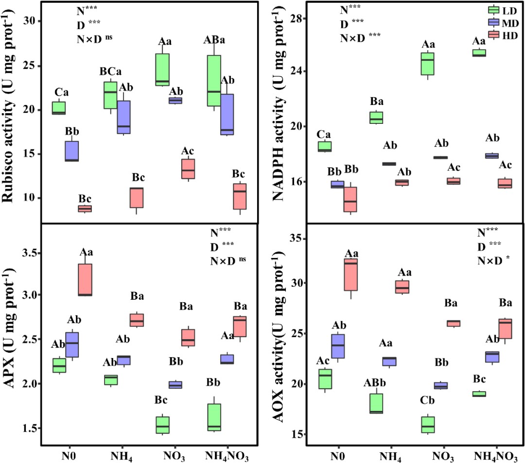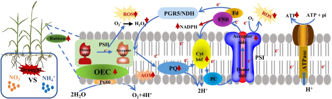 硝态氮通过促进羊草光合机构酶活性来减轻氧化损伤。硝态氮显著激活AOX,消耗干旱造成的过度还原力,维持羊草叶片的电子传递能力,减少氧化损伤。