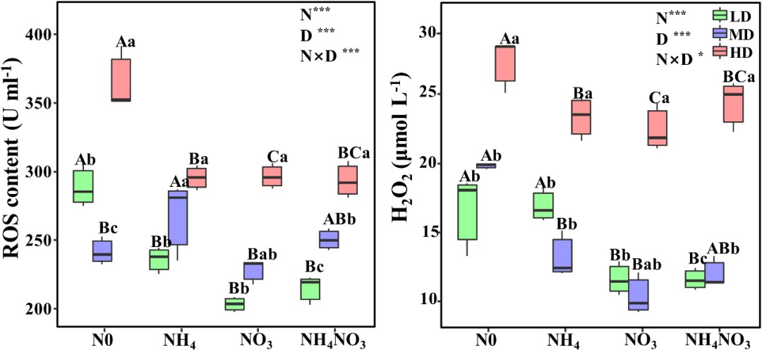 图4 不同氮素形态和干旱胁迫下羊草叶片ROS和H2O2的变化