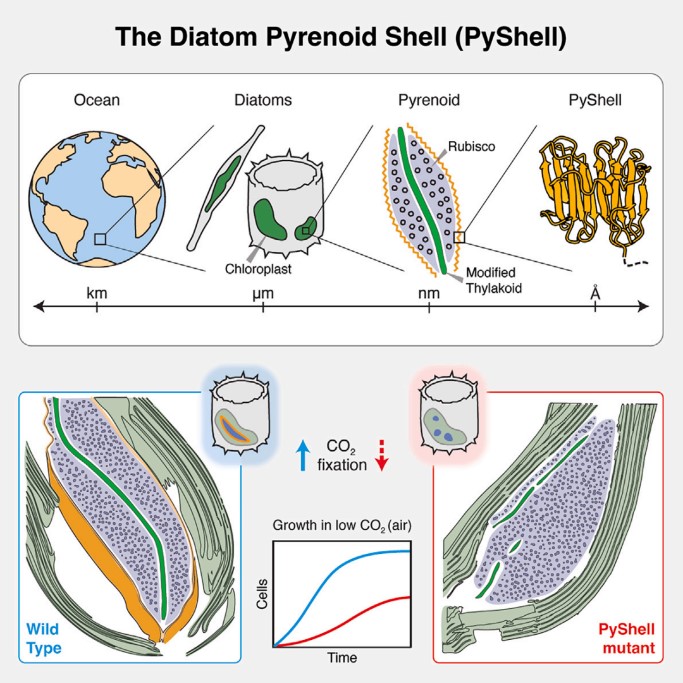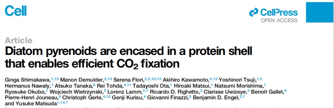 近日,日本关西学院大学(KwanseiGakuinUniversity)生物与环境科学学院生物科学系YusukeMatsuda课题组联合瑞士巴塞尔大学生物中心(TheUniversityofBasel’sBiozentrum)BenjaminD.Engel等多家研究机构,在Cell上发表了题为“Diatom pyrenoids are encased in a protein shell that enables efficient CO2 fixation”的研究性论文,该研究首次发现了第3种藻类蛋白核类型——具鞘蛋白核(PyShell),并分析了硅藻蛋白核PyShell的结构和功能,阐述了它在Rubisco有效催化CO?固定中的贡献,为研究海洋生态系统中CO?的同化途径提供了重要参考。