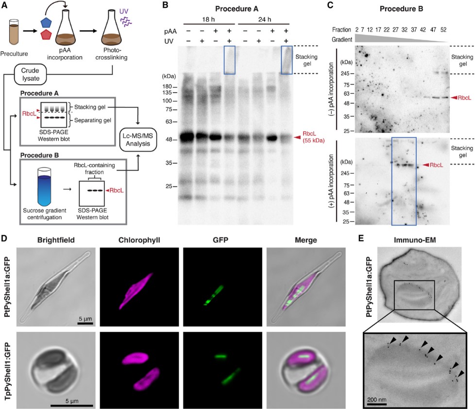 进一步观察PyShell基因被破坏的硅藻二级叶绿体,发现正常的蛋白核结构无法形成,蛋白核周围的片状结构消失,蛋白核结构崩解并破碎。这表明由PyShell形成的正常蛋白核结构对Rubisco的CO?供应至关重要(图6)。