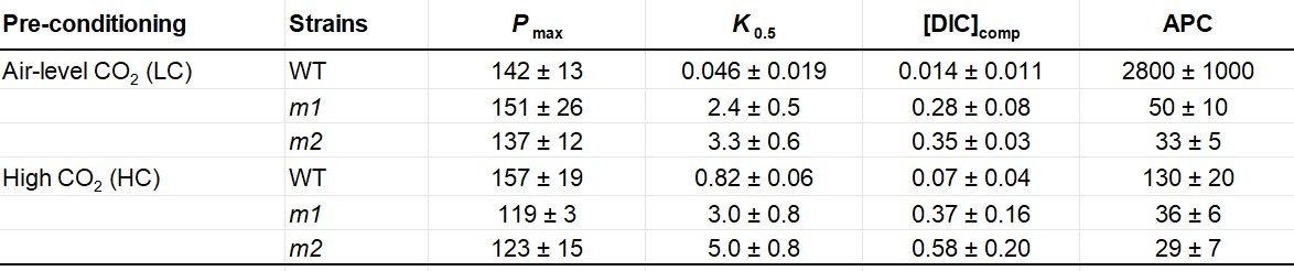 通过基因组编辑技术破坏硅藻的PyShell基因后,这些基因被破坏的硅藻在空气环境的生长速度显著变慢,光合作用效率显著降低,仅为野生菌株的1/80(图5)。在向反应体系中逐步加入NaHCO3的过程中,通过液相氧电极(Hansatech,King'sLynn,U.K.)和气相色谱火焰离子化检测器同时测量硅藻(WT、m1和m2)样品混合物中净O?的释放速率和DIC的总浓度。根据O?释放速率与DIC浓度的关系曲线计算光合作用参数:Pmax,最大净O?释放速率;K0.5,Pmax的一半时DIC浓度;[DIC]comp,无净O?释放时DIC浓度;APC,表观光合传导率(表1)。