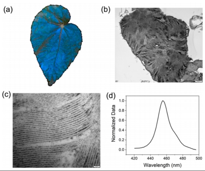 图1(a)秋海棠叶片 (b和c)叶片透射电镜图像(d)叶子的反射光谱