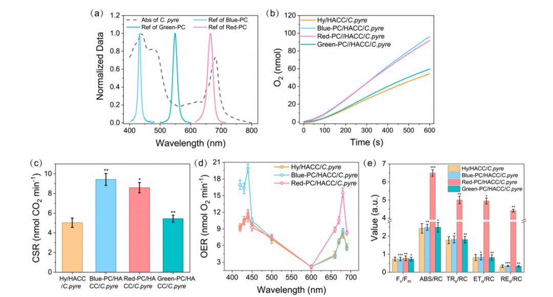 同时,为了直接分析光合色素对光能的吸收和捕获,作者使用英国Hansatech公司的Handy PEA植物效率分析仪对相关参数进行了测定分析。如图3e所示,Red-PC/HACC/C. pyre的光能吸收(ABS/RC)和捕获(TRo/RC)性能明显优于Hy/HACC/C. pyre。随后在电子传递链中的电子转移(ETo/RC)和电子受体还原能力(REo/RC)也得到了相应的改善。PSII最大光化学效率(Fv/Fm)由于捕获和吸收能量的同步增加而略有增加。在相同条件下,不含C. pyre的Red-PC/HACC没有有效值,说明是光能利用的提高促进了光合性能的提高。由于的Handy PEA的光源是红光,而Blue-PC和Green-PC在这种情况下不能工作,因此Blue-PC/HACC/C. pyre和Green-PC/HACC/C. pyre的结果与Hy/HACC/C. pyre相同。