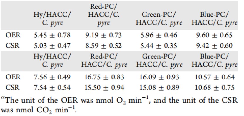 通过比较这三种不同波长(蓝光、红光和绿光)PC水凝胶对C.pyre光合作用的影响,可以更清楚地了解慢光子效应的作用和机制。作者使用英国Hansatech公司的Chlorolab2+(液相氧电极测定系统)和美国PP Systems公司的CIRAS-3(便携式光合作用测定系统)分别测定氧气释放速率(OER)和碳固定速率(CSR),结果表明,Blue-PC/HACC/C. pyre and Red-PC/HACC/C. pyre的光合效率的显著提高(图3a,b,c,表1和 图4)。