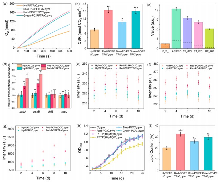 图5(a和b)白光下不同PC/PFTP/C. pyre氧气释放速率(OER)和碳固定速率(CSR)(c)Red-PC/PFTP/C. pyre的叶绿素荧光参数(d、e、f和g)不同光强下psbA, psaB, chlB, and rbcL相对表达量和ROS水平(h)生长曲线(i)白光下PC/PFTP/C. pyre脂质含量