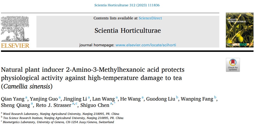 2-氨基-3-甲基己酸(AMHA)是一种独特的天然植物抗高温胁迫诱导剂。南京农业大学生科院陈世国团队以温敏型茶树品种“龙井43”为材料,利用英国Hansatech公司生产的Handy PEA植物效率分析仪等仪器,研究了AMHA提高茶树夏季高温抗性的田间药效及其生理机制。研究结果“Natural plant inducer 2-Amino-3-Methylhexanoic acid protects physiological activity against high-temperature damage to tea (Camellia sinensis)”发表在Scientia Horticulturae(IF=4.342)杂志上。