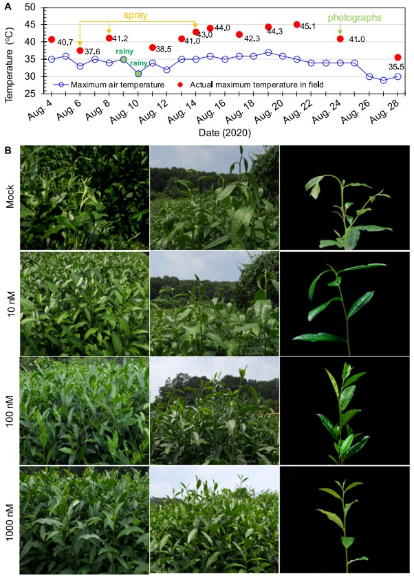 由图1A可以看出,试验期间田间平均最高气温和实际最高气温分别在34℃和40℃以上。在第三次喷雾处理后7天,田间实际最高温度达到45.1℃(图1A)。在持续暴露于40℃以上的温度,特别是在8月21日遭受45.1℃的极端高温后,对照处理实验田中的许多茶树表现出严重的头部新枝下垂,甚至新芽和新叶萎蔫(图1B)。然而,在10nM AMHA处理的实验田的一些茶树中仅观察到新叶的轻微下垂。用100nM和1000nM AMHA处理的茶树具有直立的茎和正常的叶(图1B)。显然,外源施用极低剂量AMHA可以显著增强大田茶树对夏季高温的抗性。