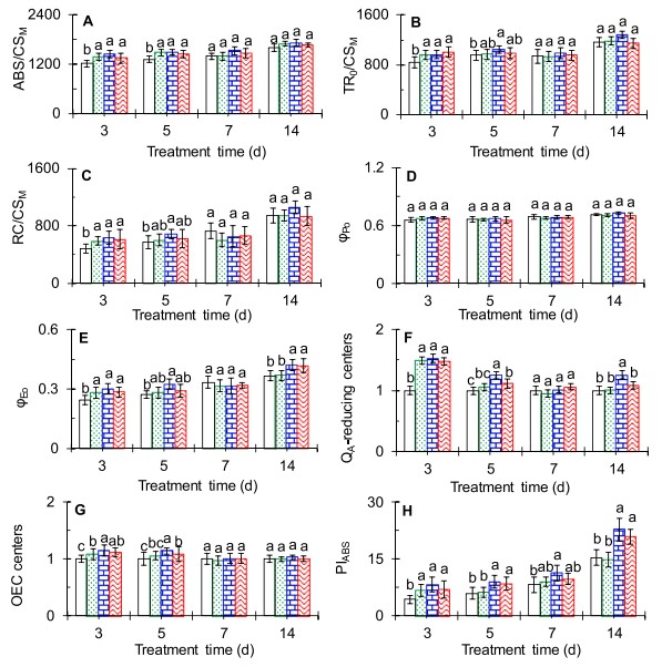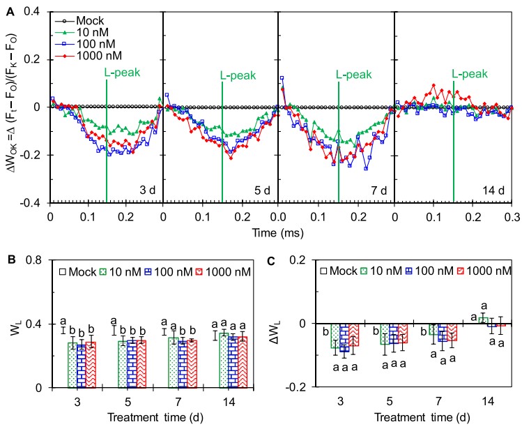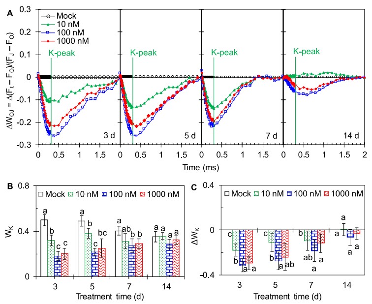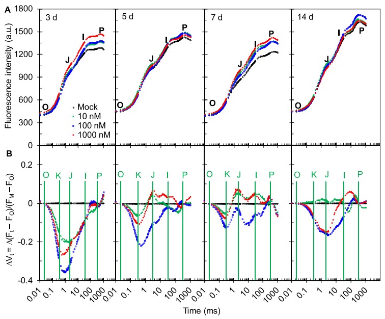 为了研究AMHA在高温胁迫下提高光合速率的机制,在用不同浓度的诱导物处理后3d、5d、7d、14d测量茶树的荧光上升OJIP曲线(图2A)。AHMA处理的茶树的每条OJIP曲线的荧光产额均高于对照处理的茶树。可以看出,外源AMHA的施用缓解了高温对茶树荧光上升动力学的负面影响。为了获得比原始荧光动力学更详细的信息,将OJIP曲线进行双重归一化,ΔVt = Vt(处理)- Vt(对照)(图2B)。AMHA和对照处理之间ΔVt曲线的主要差异是出现负K峰。在100 nM AMHA下,与其他处理相比,还观察到较低的J峰(图2B)。有趣的是,100 nM AMHA比最高浓度的1000 nM AMHA对HT具有更好的保护作用(图2B)。