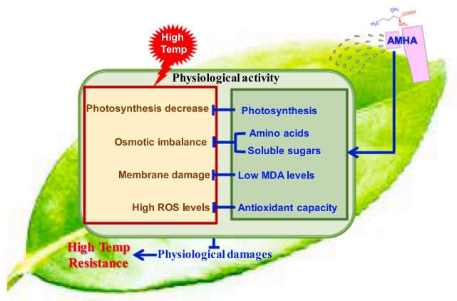 研究人员将本试验的发现整合为AMHA诱导茶树对高温抗性的生理机制模型(图7),并作出如下总结:高温破坏光合机构,产生过量的活性氧,引起氧化膜损伤,导致渗透压失衡,降低光合作用。外源AMHA主要通过提高茶树光合能力、增强抗氧化酶(POD、CAT和SOD)活性降低MDA含量、增加总氨基酸和可溶性糖含量从而维持渗透平衡、改善光合作用等途径缓解高温胁迫对茶树的生理伤害,最终提高茶树对高温胁迫的抗性水平。这些发现将有助于AMHA作为新型植物诱抗剂的开发与应用。