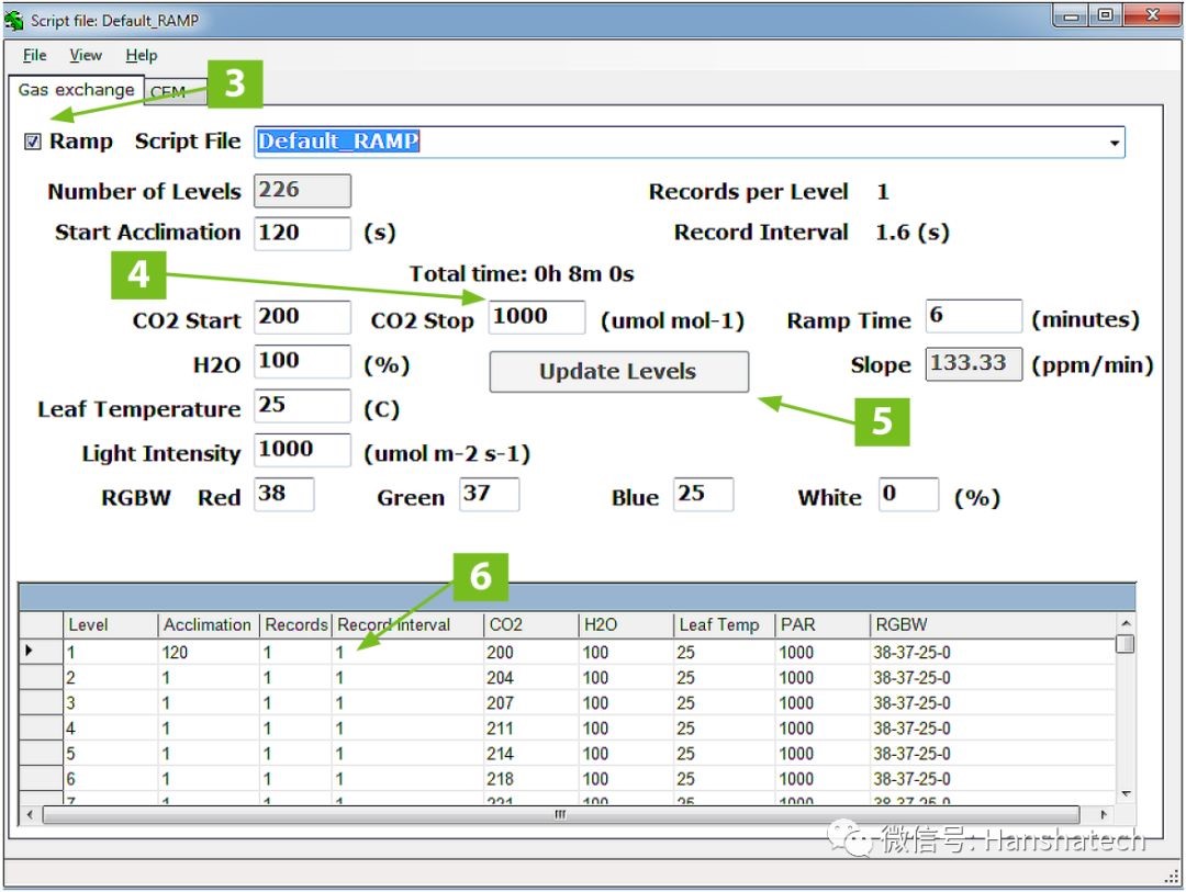 4)编辑起始CO2浓度(CO2 Start)、终止CO2浓度(CO2 Stop)、响应曲线时间(Ramp Time,以及其它试验参数;