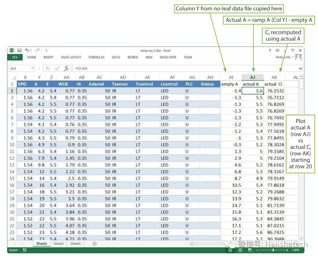 4)如图计算实际净光合速率:即图中Actual A = ramp A (Col Y)- empty A