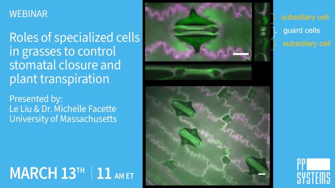美国PP SYSTEMS公司将于美国东部时间2024年3月13日上午11点邀请美国马萨诸塞大学阿默斯特分校生物学系Dr. Facette和Le Liu为全球用户做题为“Roles of specialized cells in grasses to control stomatal closure and plant transpiration”的学术报告,有意者可访问美国PP SYSTEMS公司官网https://ppsystems.com/webinars/注册报名参加。