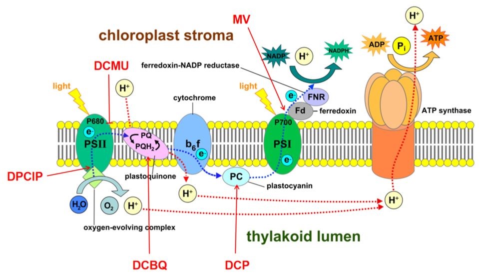 另一个是吸收红光的特殊叶绿素a分子,其吸收峰在680nm处,称为P680。由P680和其他辅助复合物组成的光反应系统,称光系统Ⅱ(PSⅡ)。两个光系统之间由细胞色素b6-f和铁硫蛋白组成的复合物连接。在外加人工电子受体和供体的情况,光合链上的电子传递可分段进行。电子传递可偶联氧的产生(水的光解)或消耗(O2作电子受体)。因此可用氧电极测定加入不同电子供体和受体之后氧气的变化反映光合电子传递的分段反应。