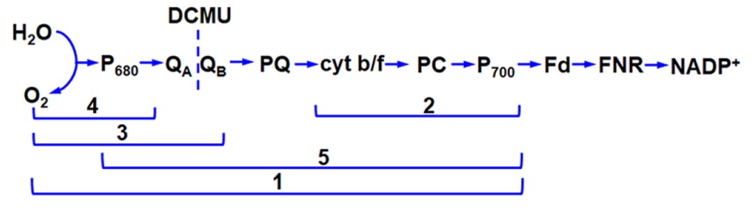 上图是光合电子传递模式图。红色字体:DPC、DCBQ、DCP和MV代表人工电子受体和供体。DCMU是电子从PSII传递到PQ库的抑制剂。1、从水到甲基紫精(MV)的电子传递(耗O2反应:每传递4个电子消耗1个O2,终产物为H2O2)2、从二氯酚靛酚(DCPIP)到甲基紫精的电子传递(耗O2反应:每传递一个电子消耗1个O2)。3、从水到对二氯苯醌DCBQ的电子传递(放氧反应:每传递4个电子释放1个O2)。4、从二苯卡巴肼(DPC)到甲基紫精的电子传递(耗氧反应:传递1个电子消耗1个O2)。下表是测定光合电子传递分段反应所需的体系和试剂: