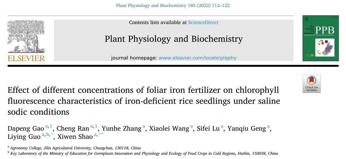 吉林农业大学农学院水稻栽培创新团队在中国东北地区松嫩平原开展水稻生理生态学研究,利用英国Hansatech公司生产的M-PEA植物效率分析仪的叶绿素荧光诱导和820nm调制反射技术,测定了不同处理水稻幼苗快速叶绿素荧光诱导动力学曲线,研究了在盐碱和缺铁胁迫下,喷施不同浓度铁肥对水稻叶片原始反应和光合电子传递链的影响。研究结果“Effect of different concentrations of foliar iron fertilizer on chlorophyll fluorescence characteristics of iron-deficient rice seedlings under saline sodic conditions”发表在Plant Physiology and Biochemistry(IF=5.437)杂志上。