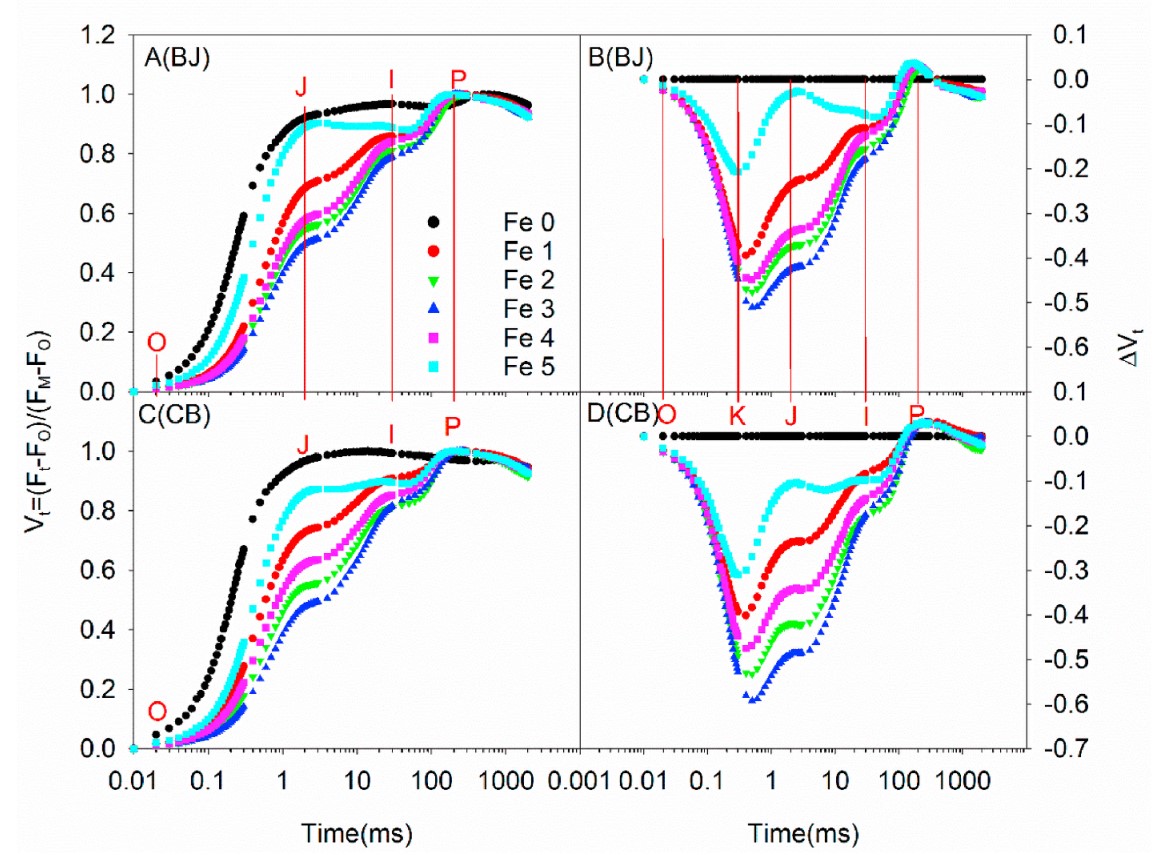 图1不同铁肥浓度下碱胁迫下缺铁水稻叶片快速叶绿素荧光诱导动力学曲线的变化。(A和C)在对数时间尺度上,Chl A荧光上升动力学标准化为FO和FM,Vt=(Ft–FO)/(FM–FO)。(B和D)为振幅变化,[DVt=DVt(处理)-DVt(对照)](n=4-6)。