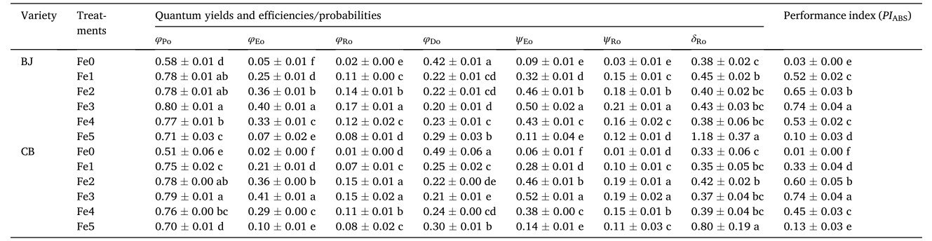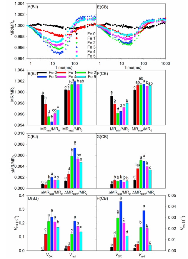 光诱导调制820 nm反射(MR/MR0)动力学可用于检测PSI反应中心中P700+的积累,以及P680最初捕获的电子对PC+和P700+随后的再还原。在这项研究中,PSI的氧化(Vox)和还原(Vred)速率在缺铁条件下与联合盐水处理(Fe0)严重受限。这可能是因为缺铁和盐胁迫破坏或减少了PSI的核心复合物和电子转运蛋白,抑制了P700和PC的氧化和还原速率。本试验中随着铁肥浓度的增加,两个品种的MR/MRO值均呈现先降低后增加的趋势,BJ和CB分别在Fe3和Fe2处理是最低。快相的末端(最小MR/MRO)是一个短暂的稳态,具有相同的氧化和再还原速率。当再还原速率快于氧化速率时,MR/MRo开始增加(慢相),并在PF瞬态达到最大值时趋于平稳。与PC和P700的氧化速率相比,喷施铁肥对PC和P700再还原速率的影响效果更明显。