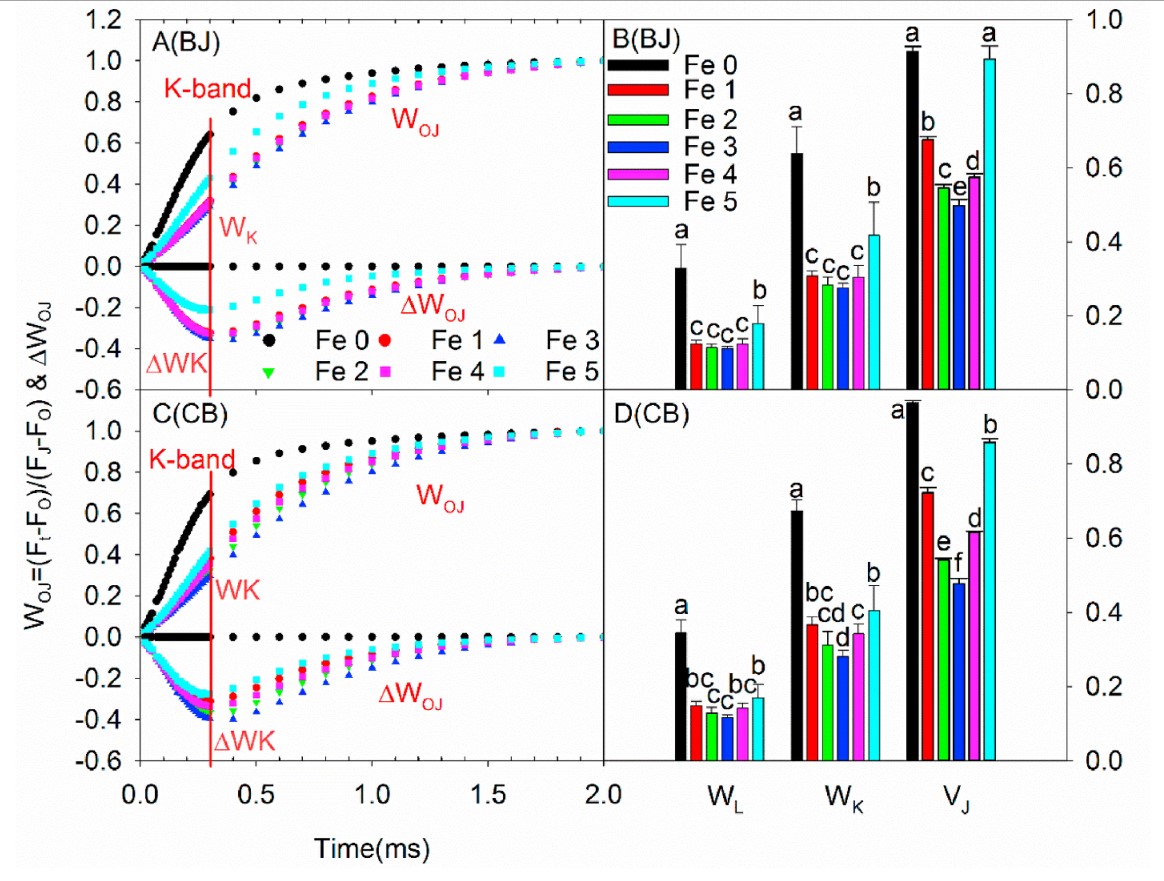 or control) - WOJ(control),K峰的增加表明PSII供体侧性能的降低,一般对应的是放氧复合体OEC的失活。但K峰随铁浓度的增加呈现先降低后增加的趋势,表明适量的铁肥可以提高放氧复合体OEC的活性,然而过量铁肥会破坏其活性。