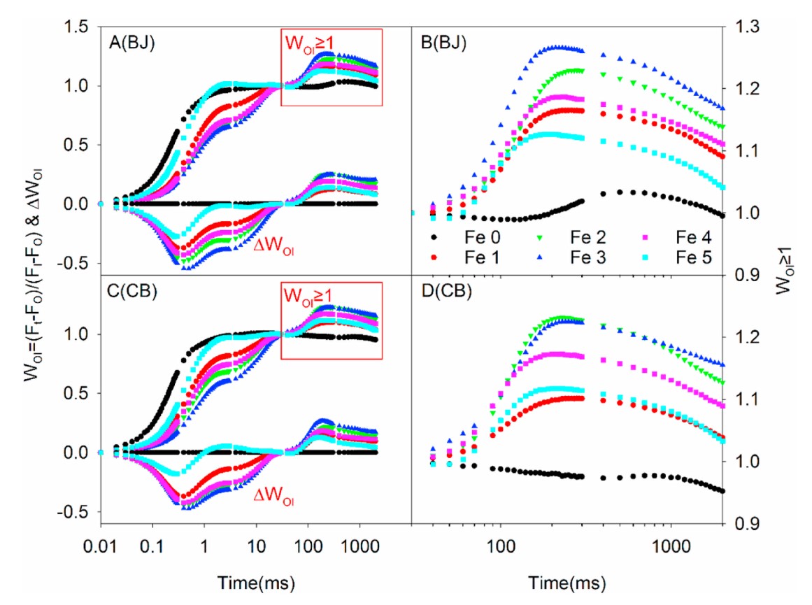 对O-I相进行分析,发现两个水稻品种整体趋势变化一致。WOI≥ 1部分I~P相的振幅反应了PSI受体侧末端电子受体库的大小,振幅越小则PSI受体侧末端电子受体库相对较小。由图可以看出适量铁肥的施用可以增加PSI受体侧末端电子受体库的大小,但过量铁肥会破坏PSI受体侧末端电子的受体库,阻碍电子的进一步传递。此外, BJ在Fe3处理时WOI≥ 1部分最大,而CB品种在Fe2处理与Fe3处理间差异不大。这说明CB的PSI受体侧末端电子受体库对铁肥的需求更少。
