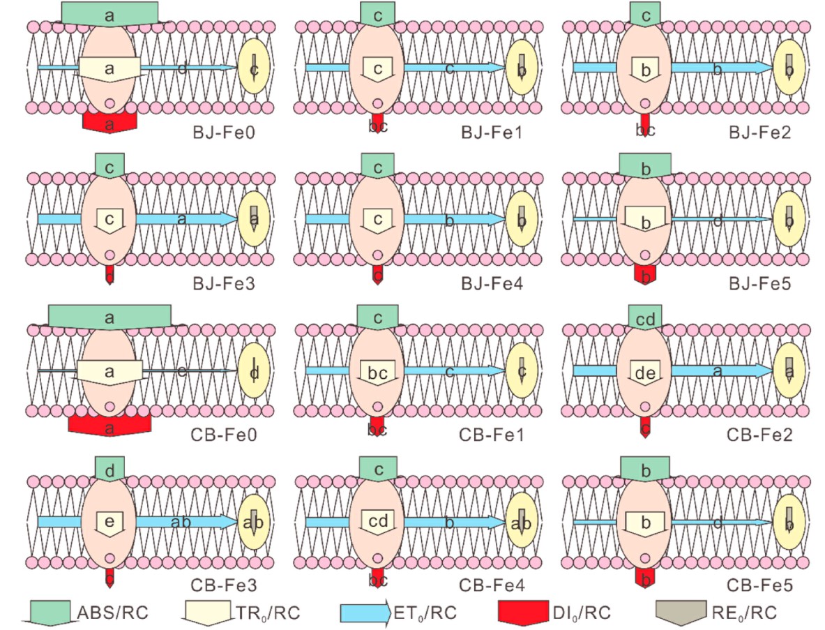 上图为不同处理间膜模型的变化,该图反映了单位反应中心的能量到PSII反应中心的流动情况,可以看出缺铁情况下,单位反应中心吸收的能量较高,并主要用于被捕获和热耗散,用于传递和传递到下游的能量较少。喷施铁肥后,吸收、捕获和热耗散的能量降低,用于传递的能量和PSI的能量增强,能量的分配更为均衡。而过量铁处理后,单位反应中心吸收、捕获和热耗散的能量呈现增加趋势,用于电子传递的能量减少,这表明铁在电子传递链中有利于维持能量在电子传递链中的传递。在BJ各处理中,Fe3处理用于热耗散的能量最低,用于传递并且传递到PSI末端电子受体使其还原的电子通量最高。而在CB各个处理中,Fe2处理的ET0/RC与RE0/RC最高,虽然与Fe3处理无显著差异,但这表明了CB在能量传递和PSI受体侧对铁的需求要小于BJ。