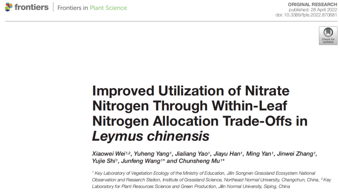 草原在应对全球气候变化方面发挥着重要作用。羊草是一种多年生根茎草本植物,被认为是欧亚草原东部地区的基础和优势牧草。近期,东北师范大学草地所未晓巍通过添加不同形式N(NH4+、NO3?和NH4+/NO3?:50%/50%),研究了羊草叶片氮同化和叶片内氮分配的影响。研究结果“Improved Utilization of Nitrate Nitrogen Through Within-Leaf Nitrogen Allocation Trade-Offs in Leymus chinensis”发表在Frontiers in Plant Science期刊杂志上。