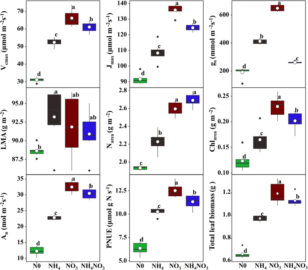 结果发现,四种不同处理--N0、NH4、NO3、和NH4NO3对最大羧化速率(Vcmax)、最大光合电子传递速率(Jmax)和气孔导度(gs)的影响是显著不同的。NO3处理的Vcmax、Jmax和gs值均显著高于N0、NH4和NH4NO3处理。NH4处理下的单位面积叶质量(LMA)显著高于N0处理,但与NO3和NH4NO3之间没有显著差异。N0、NH4、NO3、和NH4NO3处理对单位叶片面积氮含量(Narea)、单位叶片面积叶绿素含量(Chlarea)、净光合速率(An)和光合氮利用效率(PNUE)均有显著差异影响。NO3处理下的Narea显著高于N0和NH4处理,但NO3和NH4NO3处理之间没有显著差异。NO3处理下的Chlarea、An、PNUE和叶片总生物量均显著高于N0、NH4和NH4NO3处理(图1)。