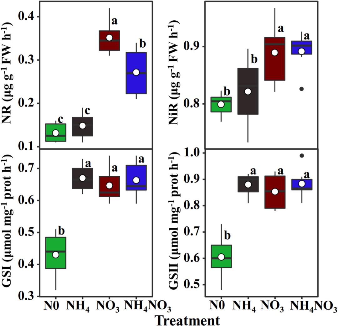 该研究还发现,NO3处理促进了硝酸还原酶(NR)和亚硝酸盐还原酶(NiR)活性,而NH4处理抑制了NR和NiR活性。相比之下,谷氨酰胺合成酶(GSI和GSII亚型)活性没有受到明显影响(图2)。