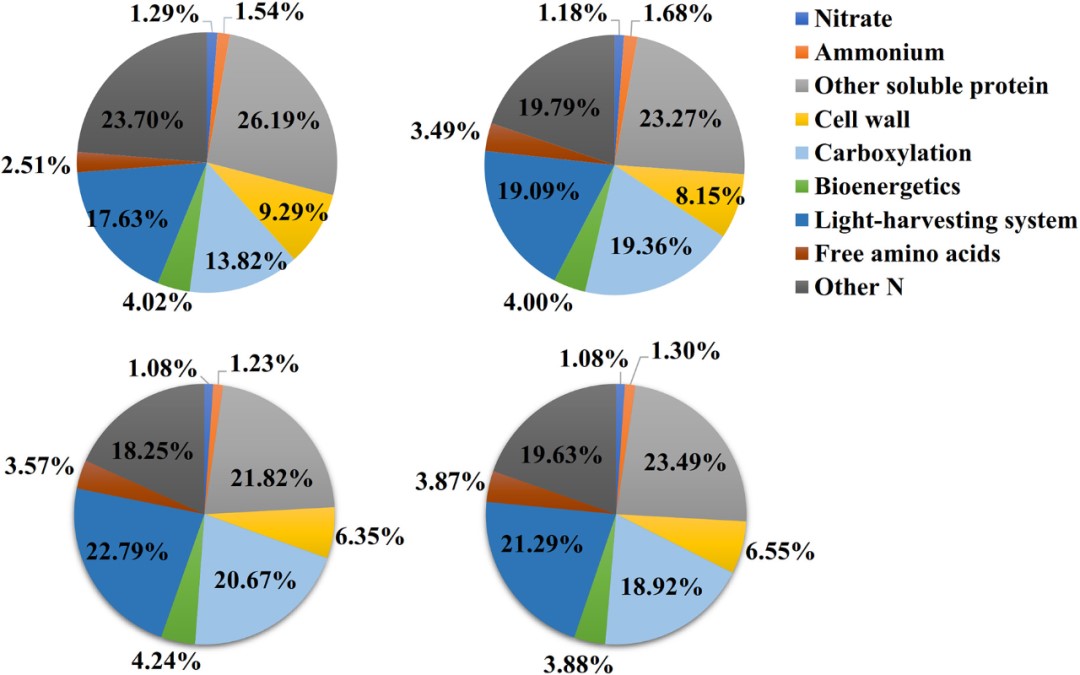 另外,NO3通过增加光合氮分配和Chlarea,显著提高了叶片PNUE和生物量。在NO3处理下,羊草中更多的氮用于生物能和光捕获系统,以增加电子传递。同时在NO3处理下,植物减少了细胞壁的N分配或增加了其可溶性蛋白的浓度,以平衡生长和防御。而在NH4处理中,植物光合机构的氮分配减少,但增加了细胞壁和其他机构的氮分配(表1、图3和4)。