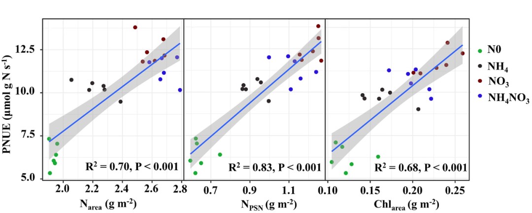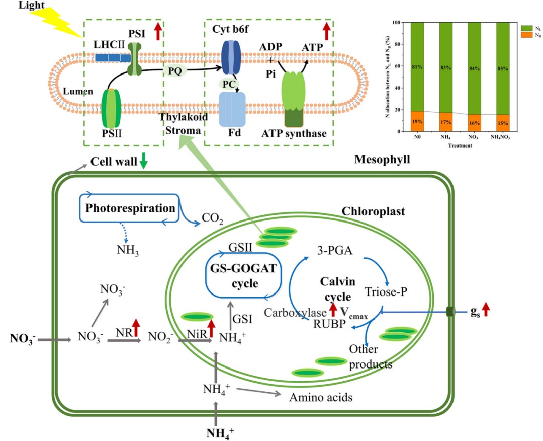 氮(N)在生态系统中起着至关重要的作用,是植物生长所必需的元素,氮主要以NH4+或者NO3?的形式被植物吸收。NH4+和NO3?也是大气氮沉降的主要形式,大气氮沉降的急剧增加可能会对氮素有效性和陆地植物的光合作用能力产生重大影响。不同功能类型的植物的氮素利用策略不同,植物吸收氮形态的不同反映植物对氮吸收和氮利用效率的差异。因此,探究叶片内氮源与分配之间的协调关系对于理解植物对氮沉降的光合响应至关重要。