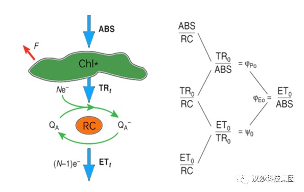 依照能量流动模型,天线色素(Chl)吸收的能量(Absorption, ABS)中的一部分以热能和荧光(F)的形式耗散掉,另一部分则被反应中心(Reaction Centre, RC,在JIP-test中RC指有活性的反应中心)所捕获(Trapping, TR)。在反应中心,激发能被转化为还原能,将QA还原为QA-,后者又可以被重新氧化,从而产生电子传递(electron transport,ET),把传递的电子用于固定二氧化碳或其它途径。