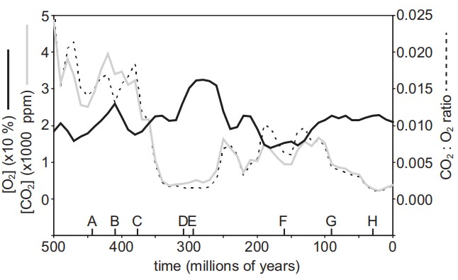 图1过去5亿年的大气中的[CO2]、[O2]和CO2:O2比率变化