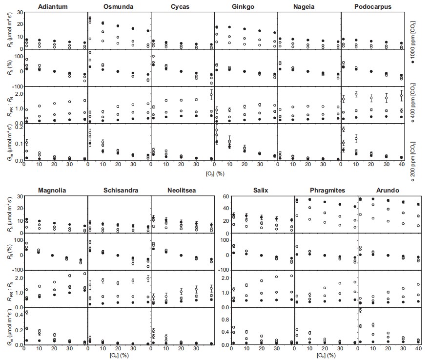 近期,意大利国家研究委员会-可持续植物保护研究所Mauro Centritto团队将12个系统发育不同的物种暴露于亚环境、环境和超环境[O2]和[CO2]的组合中,以检测PN的生化和扩散成分,以及[O2]作为选择压力的可能作用。