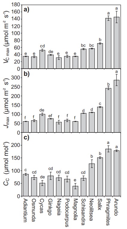 在两种单子叶被子植物P.australis和A.donax中观察到了最大的PN增加率和最高的PN饱和水平。这与在环境[O2]时测定PN–Ci曲线计算所得的Vcmax和Jmax速率一致(图4)。单子叶植物在亚环境[O2]时也表现出最低的RPR:PN比(图2),以及较大的Vcmax(图3和4)。