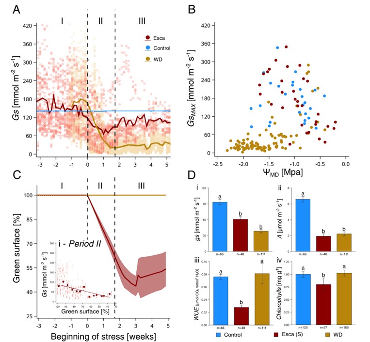 因此,有观点认为干旱和依科病之间具有强大协同作用,而这种作用可能会加速植物死亡。由于葡萄并不能依靠人为的病原菌接种来感染依科病,而自然条件下被感染的植物又缺乏环境数据的记录,因此这一观点是否成立仍有待进一步进行研究证明。