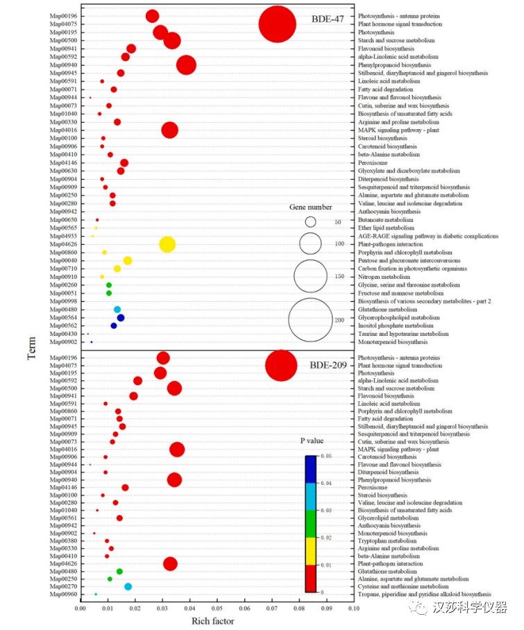 综上所述,BDE47和BDE209对烟草生长均有抑制作用,其中BDE47的影响更显著。BDE47和BDE209主要影响烟草的光合作用、植物激素合成与信号转导以及对胁迫的响应等代谢过程。